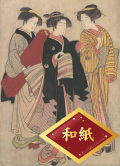 書店の息子として生まれた北尾重政は、役者絵や美人画、風景画など優れた作品を残し、また絵本や黄表紙の挿絵も沢山手がけました。 蔦屋重三郎に依頼され、遊女を花に見立てた本「一目千本」や、勝川春章との共作本「青楼美人合姿鏡」でも有名です。 この作品の中央の黒い振袖の女性が芸者で、仲居を従えています。 後ろで女中が三味線の箱を持っています。 佐賀県重要無形文化財指定「名尾手すき和紙」を使用しています。
