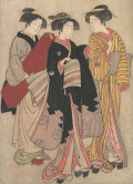 書店の息子として生まれた北尾重政は、役者絵や美人画、風景画など優れた作品を残し、また絵本や黄表紙の挿絵も沢山手がけました。 蔦屋重三郎に依頼され、遊女を花に見立てた本「一目千本」や、勝川春章との共作本「青楼美人合姿鏡」でも有名です。 この作品の中央の黒い振袖の女性が芸者で、仲居を従えています。 後ろで女中が三味線の箱を持っています。